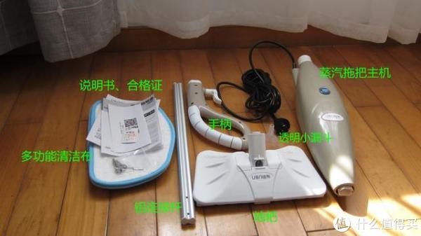 开箱后,有蒸汽拖把主机、手柄、地耙、清洁布等主要配件,需要自己组装。