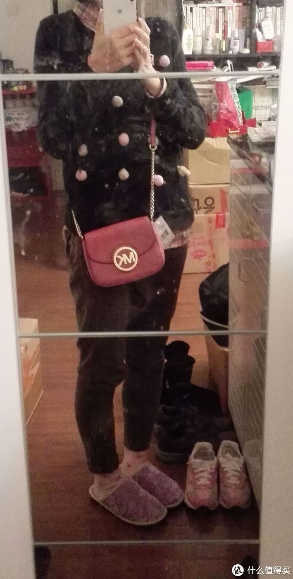 最后来个定妆照。还是挺小巧可爱的是不?适合平时逛街买菜遛狗遛娃之类的使用,手机+零钱+N张卡+钥匙+纸巾+护手霜+唇膏+……,要是有短款钱包或许可以放得下,长款就别指望了。