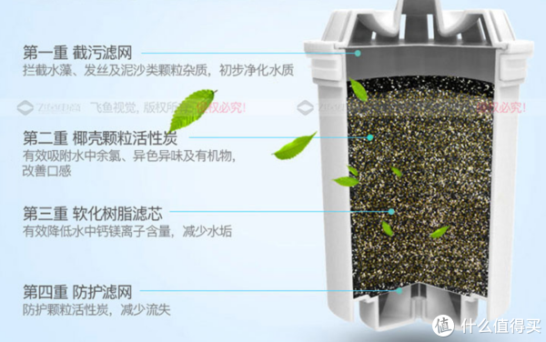 滤芯采用了四重过滤技术,有效保证水质的洁净。第一层是最上面截污滤网,对于一些发丝或者水藻和泥沙这些比较大颗粒的杂志实现第一重过滤,从而初步净化水质。第二层利用椰壳颗粒活性炭,有效吸附水中的余氯、一色异味的有机物实现改善口感的目的,第三重是软化树脂滤芯,有效降低水中钙镁例子含量,减少水垢,最后一层是防护滤网,用来防护颗粒活性炭,减少流失。