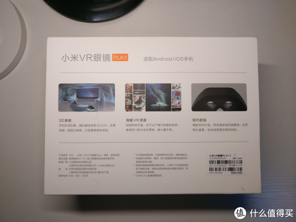 包装盒背面介绍了产品的三大特色——3D影院、海量VR资源、轻巧舒适。下方的文字介绍里面说明了产品的型号和包装盒里面的东西——小米VR眼镜PLAY、绑带、说明书。建议设备为4.7-5.7英寸屏幕的安卓或苹果手机。需要注意的是13岁以下儿童谨慎佩戴使用。右下角的标签上小字印着小米VR眼镜PLAY2的字样。