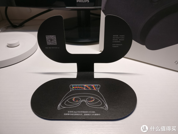 说明书就是一简单的卡片,里面的介绍也非常简单:扫描二维码下载相应的小米VR APP软件,并在手机APP中打开相应的VR内容,将屏幕中线与刻线对齐,竖直插入VR眼镜中。