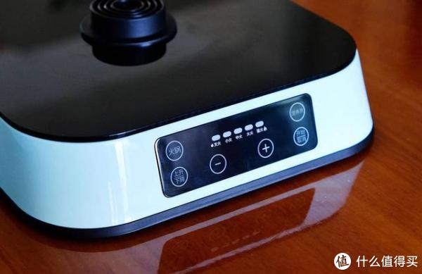 在底座上有简洁明了的触控式按键设计,标有五档火力调节,最高功率为1500W。用中文标识清晰明了,文火、小火、中火的标识即使是老年人也可以轻松操作。当然除了通过按键加减进行温度调节外,臻米升降电火锅还专门设有两个功能键,分别是火锅和营养蒸,用户无需手动调节,实现快速启动。在控制面板的左下角设计了上升和下降键,这也是这款火锅最大的亮点功能。