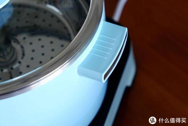 底座方面,中间位置的设计和电热壶类似设计,这样的设计可以起到快速加热的效果,1500W的功率,一锅水无需几分钟就可以沸腾,底座上面还设有钢化玻璃,清洁方面方便很多,并且底座两侧贴心的设计了两个凹槽,移动起来更为方便。