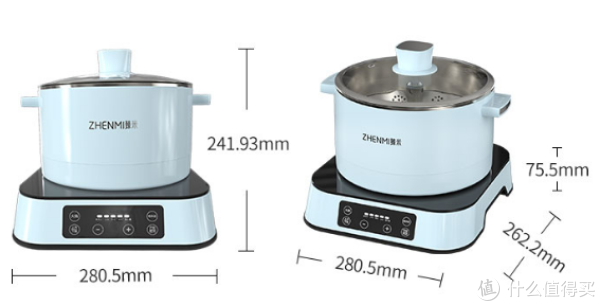 电火锅的整体尺寸为280.5mm x 241.93mm,其中底座的尺寸为280.5mmX262.2mmX75.5mm,锅体的直径为230.8mm,容量为2.5L左右。这样的规格尺寸是相比火锅店常见的尺寸要小上一些的,特别适合2-3人使用。