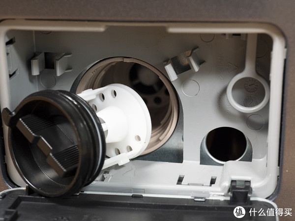 左上部分是洗涤剂料盒,抽出来可以看到,料盒分为四部分,分别对应主洗、预洗、护理及洗衣液。初一看上去,相比以往其他洗衣机,这款洗衣机的料盒稍微有点复杂,但实际使用时,多数情况下,只需记住把洗衣液放到对应的格子里,把护理液放到蓝色格子里就可以了。要注意的是,如果想要加入消毒液对衣物进行消毒的话,需要把消毒液放置到“预洗”料盒,而把洗衣液放置到对应的料盒,同时建议选择“消毒洗”功能,配合专用程序,可以在清洁衣物的同时,进行消毒清洁,并且能够减少消毒剂残留。