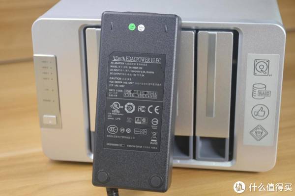 铁威马F4-421配套的电源适配器采用100-240V AC宽电压输入,可适应全球大部分国家的电源,输出规格为DC12V 7.5A,90W的功率足够带动主机加四个3.5硬盘。