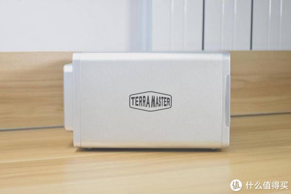 铁威马F4-421机身左右侧面均印有铁威马的LOGO,从这个角度看,铁威马F4-421的机身呈扁平状设计,底部四个橡胶垫将机身支撑起来,既能够避免与桌面共振产生噪音,又能配合机身底部的散热开孔加强散热,保障系统的正常稳定运行。