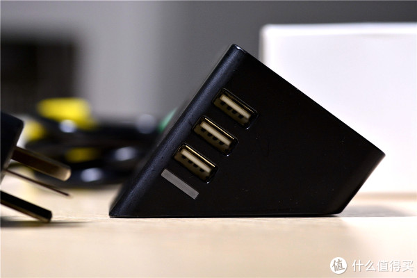 飞利浦这款插座采用了非常少见的三角造型,而且是等腰直角三角形,但是在一端切掉了一个角,OK,这个形状远看像等腰直角三角形,实际一看是个直角梯形,最大的一个面给了底座,另两个面各一个五孔新国标插座,USB接口被设计在了侧面,这样的设计其实也很有新意,避免了满插时各组线材的交叉混合。