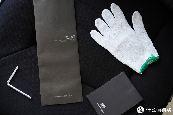 为了照顾女性用户,厂家除了内六角工具之外,还提供了一个白线手套,方便在安装的时候不伤到手。此外,在说明书里,配备了十分详细的图文安装教程,即使是女生也能很轻松的安装完毕,其实说白了就是插上底轮、插上座位、拧好螺丝就行了。