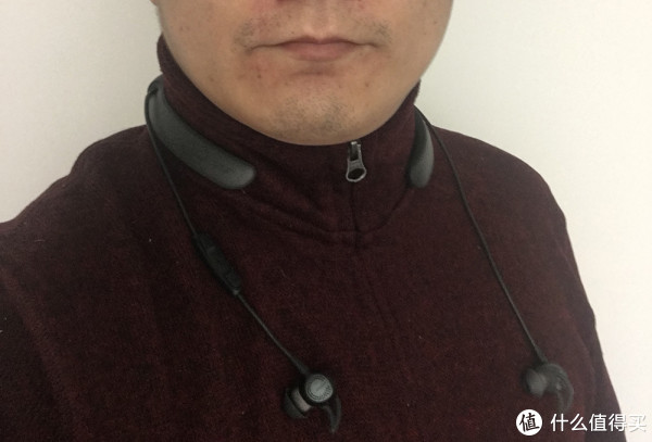 佩戴效果,下面是穿了一件优衣库的摇粒绒拉链外套,方面领子外面无压力,比森海塞尔的那个要贴合更好一些,但是项圈的材质不如森海塞尔的那种真皮的感觉好,而且有前辈说时间长了会脱胶,不过国行可换,希望不要发生这种问题。