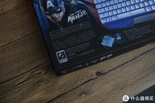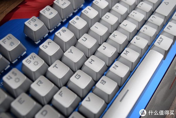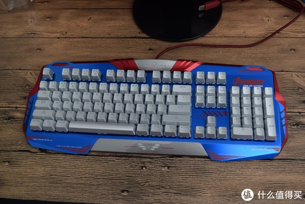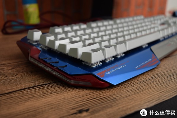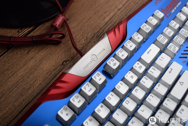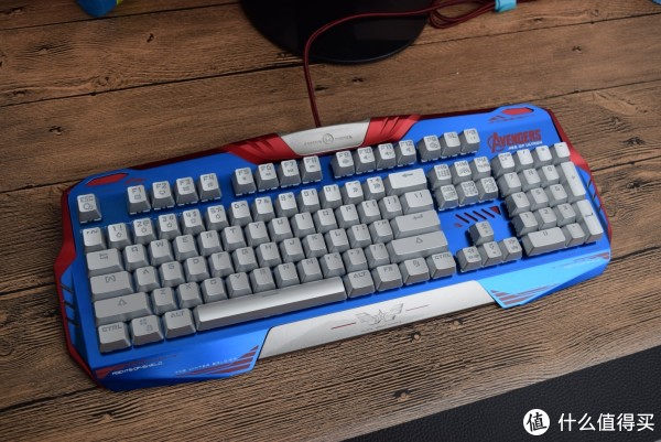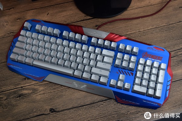 红蓝白三色 为美队盾牌的配色,不得不说这中造型和配色的机械键盘在机械键盘界就是一个另类的存在,但是是我的菜 谁都有追求个性的权利嘛