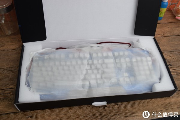 包装内部,一个泡沫包裹键盘,旁边两个海绵有减震效果,防止暴力运输对键盘的损坏。包装简略了点。将近四百的键盘不应该用这样样的包装吧。