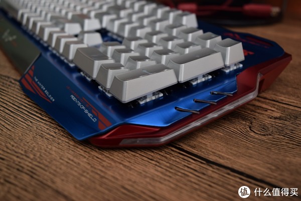 宜博 K729机械键盘的侧边很有个性,红蓝配色交接,金属的反光很像是美队盾牌的金属反光。边框细节更是丰富,同时棱边元素较多,充分展示出了键盘应有的厚重感。