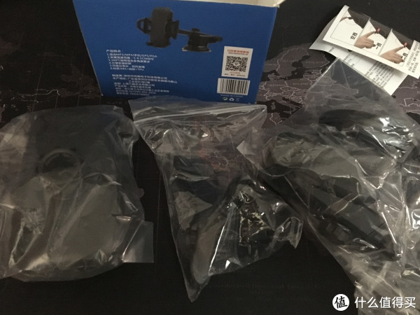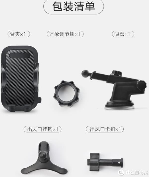 包装里面的部件分为三小包,里面分别为背夹,万向调节扭,吸盘,出风口挂钩,出风口卡扣