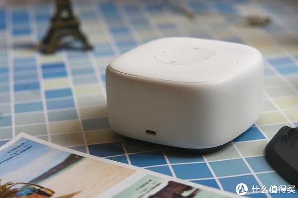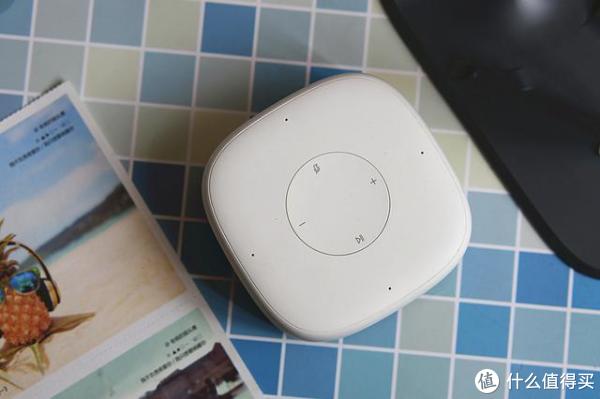 它的大小尺寸为90×90×50mm,像一个方形的小盒子。在它的顶部中间是手动控制区,可以调节音量,禁麦和暂停/播放。旁边的四个小孔是麦克风。