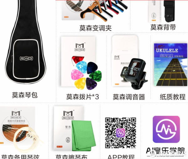 随手找了个大人的尤克里里套装对比下,不过这个套装得300多了,随便玩玩买个小的也行了。