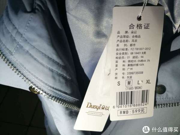 ▲合格证上标注了品牌、面料、货号、产地和尺码等等信息。