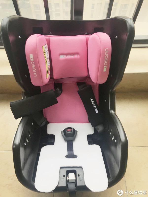 椅身的面料摸着很舒服,粉色的新生儿垫和头枕按压弹性很好,可以很好的包裹宝宝,缓冲性和舒适性应该挺不错,现在我家宝还可以用这个垫子,估计大点了就要拿掉才能坐的下了。