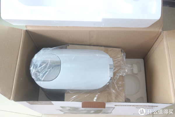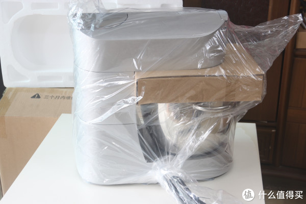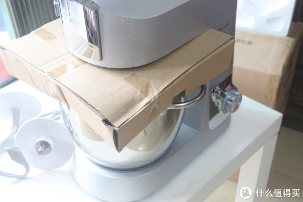 厨师机很重,我一个人倒腾还是有点难搬动。机器移出来,带包装袋和拆开包装塑料袋展示。不得不说,中间那个纸皮盒子隔着真好,这个包装我给100分。