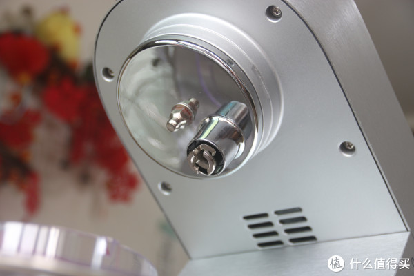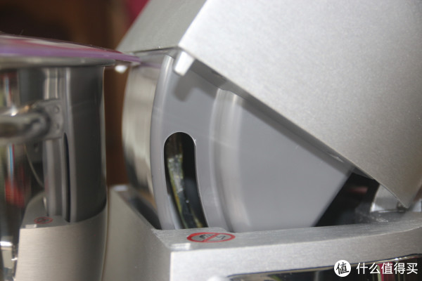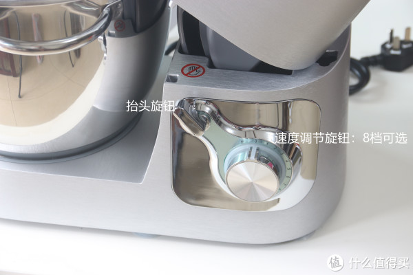 细节:抬头旋钮、速度调节。工作时,旋钮处有动感蓝光,挺有科技感的。轻轻向右扭动抬头旋钮,就可以把主机搅拌头抬起了。