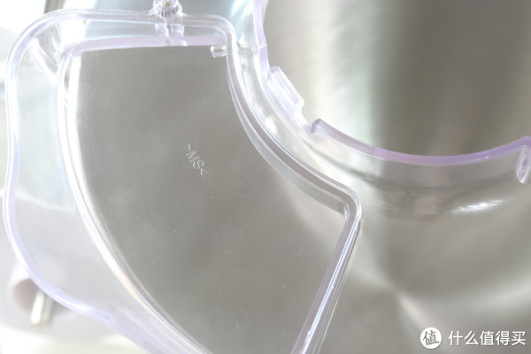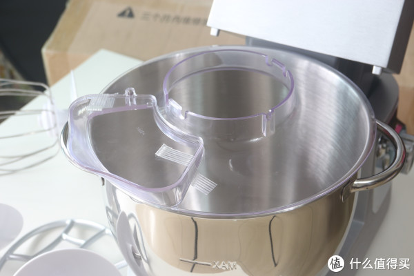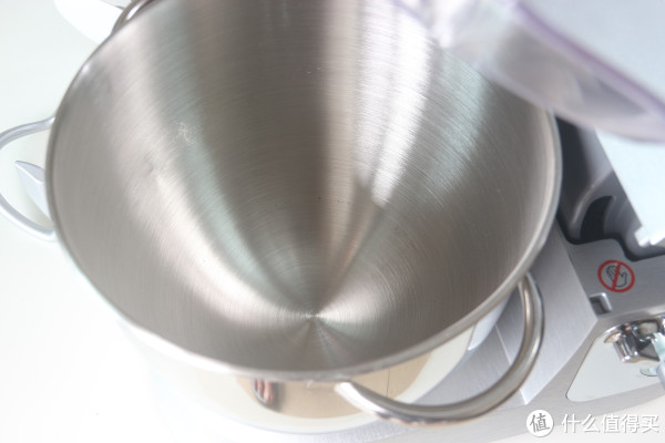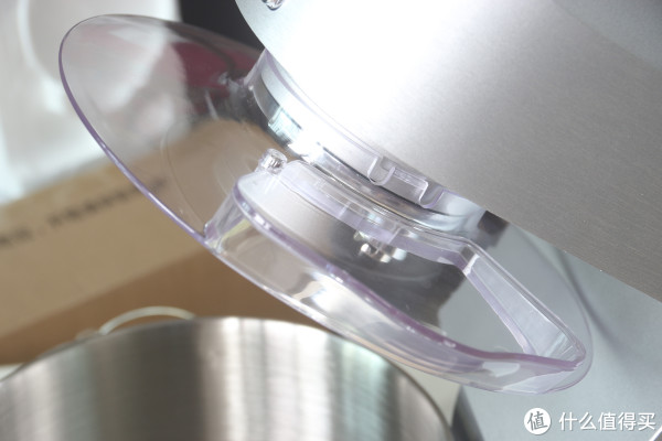 透明防溅碗盖,打发时可以有效挡住飞溅出来的食材、液体等。揉面时不加盖子也没问题,这个搅拌碗(搅拌桶特别深,5.5升大容量),搅拌碗(搅拌桶)的内外展示,底下有几个小金属块可以卡在主机底座上。