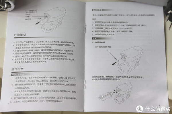 压面机配的简单、清晰的说明书,有提醒制作面条时的水分怎么加。