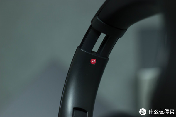 黑色的头梁内部两侧是区分左右的标识,不要小看这个标识,能否把它很好的融入到耳机设计中,是考量耳机设计者能力的一个侧面,这个表示即要保证用户非常方便辨识耳机左右,又要与耳机的设计风格相协调,我曾见到过一些很好的耳机外观设计,但是标识却被生硬的喷漆在头梁上,影响了耳机整体的美观。