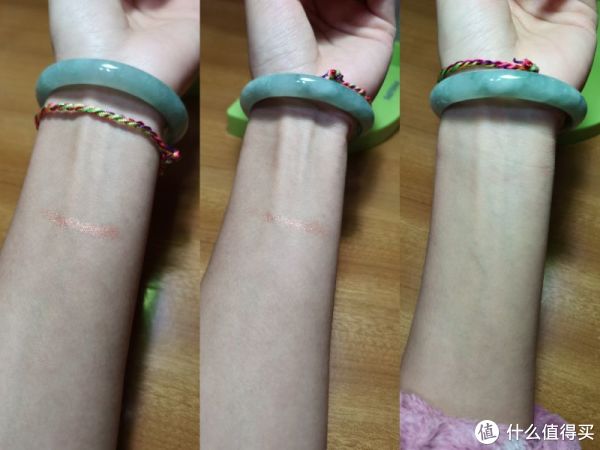 打开后李太太在手臂内侧画了一笔,笔感细腻,上色不错,没有异味(包括香味)。后来李太太用一张纸巾擦了一下,颜色下来些,但是并不严重。嗯,这个估计是灯光的原因,显得好像擦掉不少。第三张照片是李太太用za的卸妆蜜擦了一下,基本就干净了,看不出来眼影的痕迹,卸的蛮干净的。