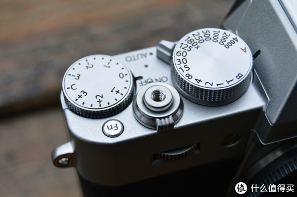 相机的顶部是金属材质,很具有质感,手感摸上去会感觉比较冰凉,各个功能的机械拨盘都设置在了相机的顶部▼