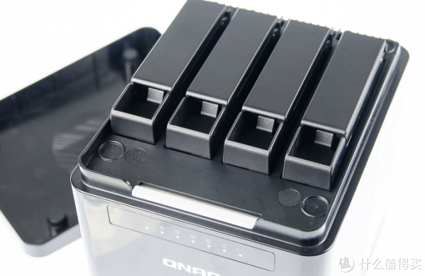 NAS上搭配的硬盘架也是采用快拆的设计,拉起开关就可以抽出硬盘。