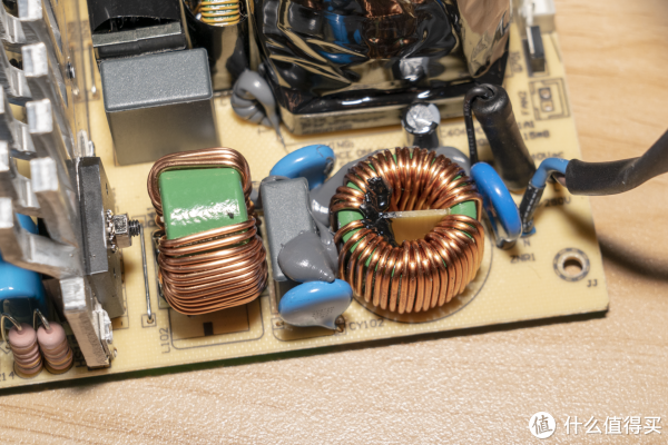 ▲回到电源本体,上面最显眼、同时也是最大的两个料件,占据了大部分空间。