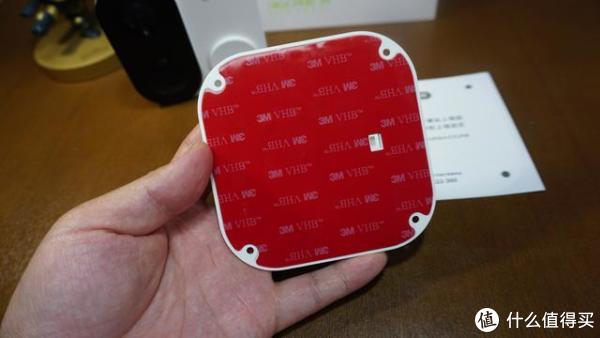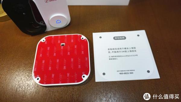 在安装上,360可视门铃在配件包里有一个安装底座以及一张定位贴纸。如果是上墙用螺丝固定时需要用到定位贴纸,这个在安装使用360摄像头时也有一张。不过安装底座的的安装也可以选择采用3M胶粘贴的方式,后被自带,粘上后可以先等一段时间,再扣上室外机,就安装完成了。