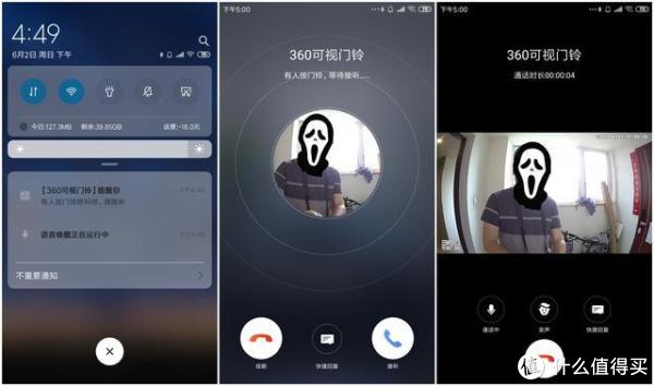 在APP上不仅可以实时查看,还可以和360摄像机一样具备人体移动侦测,比如门前有人经过,或者敲门,都会被录下。而且还可以手动录像、拍照以及对话等。还有个有趣的功能,那就是还有变声功能,让门外的人不能真实分辨出使用者的身份。