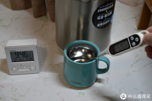 第二天早晨起床,保温时间17小时后,接水实测杯内温度为59.5度▼