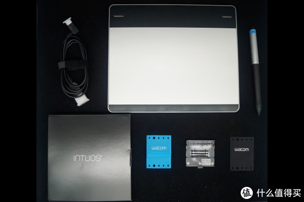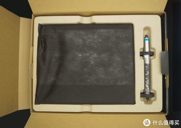 Wacom的触控板包装十分精妙,INTUOS 系列默认都是采用一块黑色口袋包裹,右边是触控笔