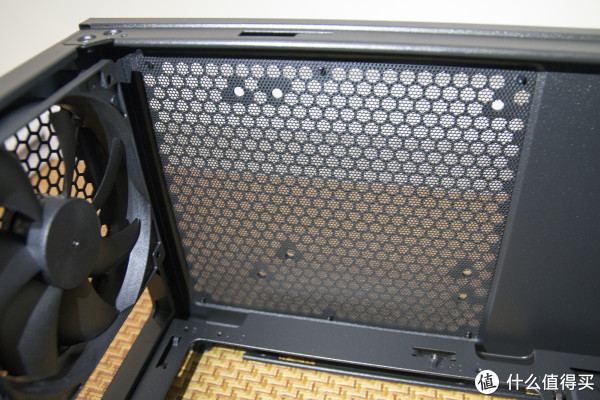 ▼顶部散热口,固定有不可拆卸的防尘网,支持12CM/14CM的风扇。。。但是这个排风口明显比14CM风扇都要大。。目测有16CM左右。。而且风扇并没设计在中间。。。实在不清楚为何不设计成可放两个12CM/14CM风扇的的规格呢。。