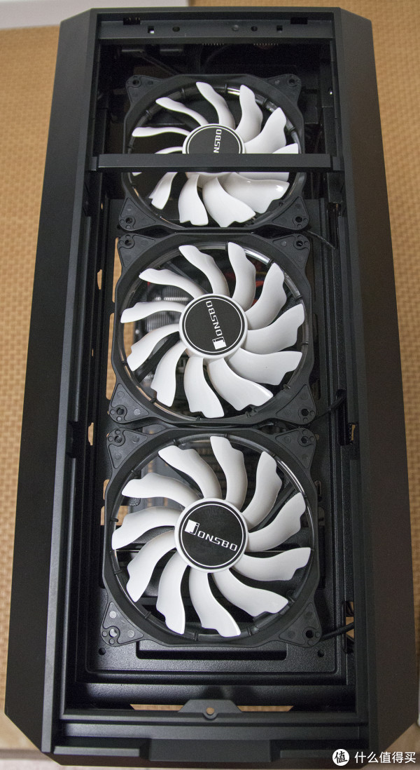 ▼前面板可以安装3个12CM风扇或者2个14CM风扇。。可以用塑料膨胀螺钉固定,也可以使用螺丝固定。。我之前已经拆了硬盘笼,所以可以很方便的使用螺丝固定风扇。。三个日食风扇都装这里了。。。