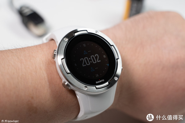 先上手看看,SUUNTO 5采用了1.1寸表盘,看起来比较小巧些,确实挺适合妹子,当然,喜欢白色的男生完全也可以佩戴,楼主戴上也没什么违和感。
