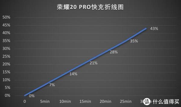 荣耀20 PRO带来了22.5W的超级快充技术,笔者特意测试了一下荣耀20 PRO的充电速度,从0%开始充电。充电5分钟达到7%;充电15分钟电量达到14%;充电30分钟达到43%。效果还是非常不错的,笔者偶尔晚上忘记充电,在洗漱的时候充下电就能让荣耀20 PRO回血大半。