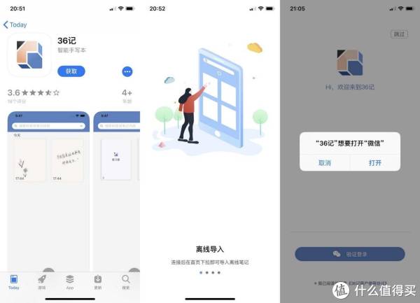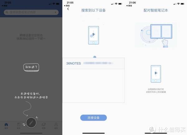 首次使用需要连接手机,记得打开手机蓝牙开关。扫码或者App Store搜索“36记”,评分3.6,对,都是36…然后微信登陆即可。