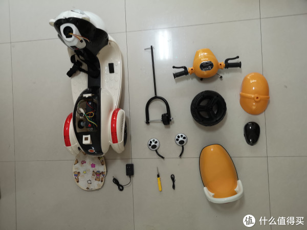 所有配件一览:机身、前轮、车把、反光镜、座椅、充电器、椅垫以及一张简易说明书。