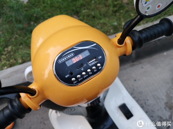 车把上方为多功能早教机(就是自带几首故事,儿歌),同时配备TF卡接口、U盘接口、音频线接口、还有音量调节、电量显示等功能。
