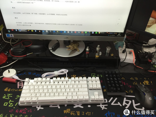 没有脚撑,usb插头显得廉价,线材非编织材料,数据线变为可拔插三出线口应该不增加什么成本吧?对了还有就是没有104键的版本87键只能如下图了,总之,高斯这个品牌,细节做了,设计做了,良心有但是不会爆表,毕竟人家也要赚钱不是吗,逼得惨了人家没钱赚倒了咋办,如果以后继续创新,我还会买,对了,前提是依旧我只买绿轴~~~