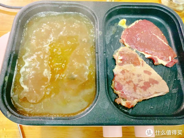 左边准备的是火锅三鲜锅底,右边是买了鲜切的牛肉,大概是西冷牛肉的那个位置吧,可以看到烤盘的速度非常快,同样是开大火的情况下肯定是烤盘这边火力更足一些。