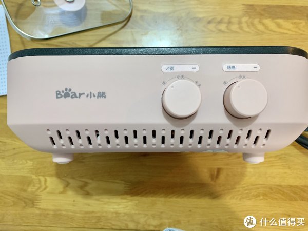 侧面看有两个简单的旋转按钮,最左边是logo,右边分别有火锅和烤盘的控制钮,可以选择小火和大火。