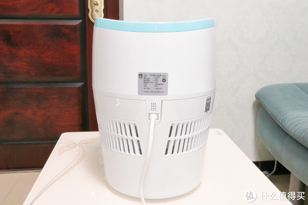 机身后面是产品标签、蜂鸣器、电源线和进风口。电源线从机身中间引出看上去有点别扭,考虑到机身下半部分是水箱,这也是没有办法的事情。