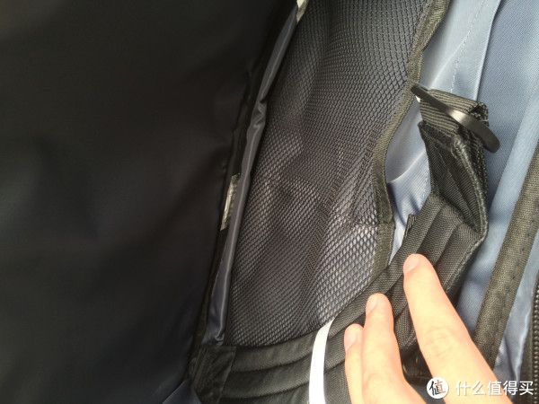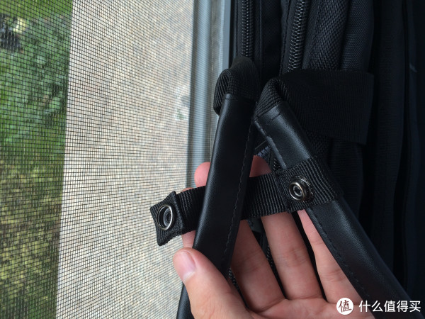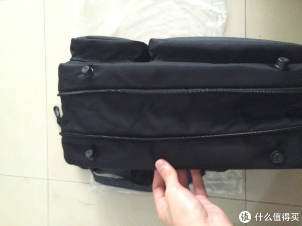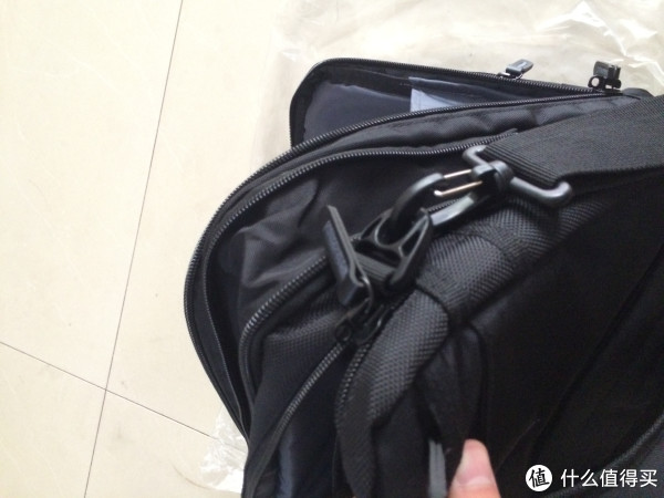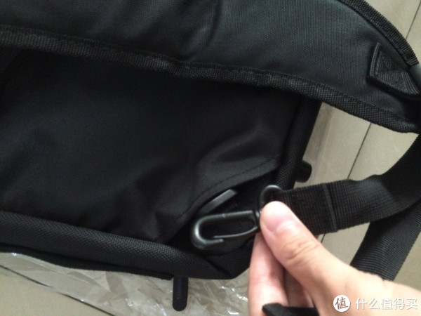 上图是挂钩链接处,材质是塑料,不知哪天会不会断掉。背部的肩带在后带夹层中,拉开后扣到底部的扣环上,即可成为背包。