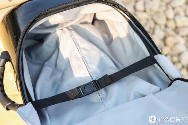 在里面的空间里还有一个绑带,不过作用并不是特别大,跟传统行李箱的X型绑带比起来捆束能力还是差一点,不过考虑到这款懒人行李箱的打开方式,其实也不太需要太强的捆束能力。传统行李箱需要更强的捆束能力是因为在打开时总有一面是朝下的,所以总要克服地心引力,不让翻转那一侧的物品掉落。