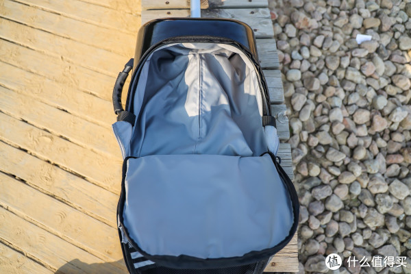 中间的一个夹层,可以用来装一些孩子的电子产品,比如电子词典、iPad甚至用来装自己用的笔记本电脑都可以,因为它上面有一个魔术带,而且里外都有一层类似泡沫似的夹层,可以保证物品受到挤压的时候有比较充足的缓冲空间。