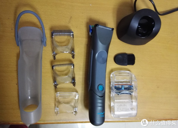 蓝盒子里有以下几个东西:3个嵌套头、1个吉列Fusion5 刀头+塑料收纳盒(机器自带一个吉列刀头)、1个悬挂保护套、充电器一个、刷子一把。